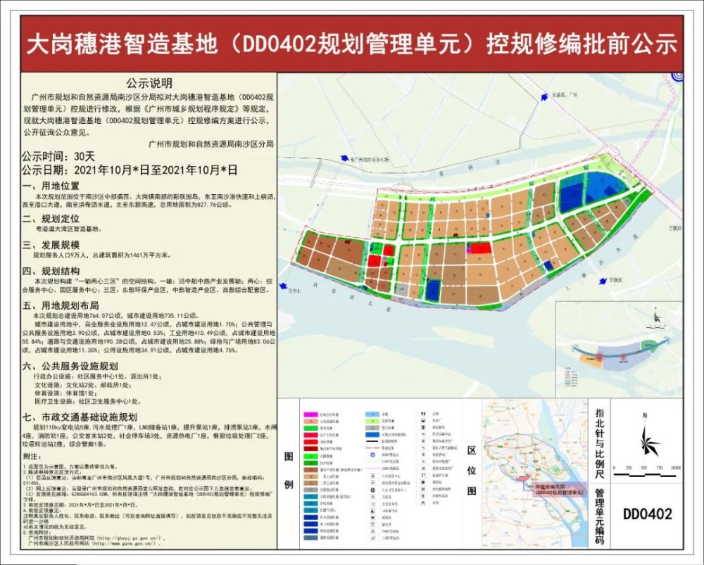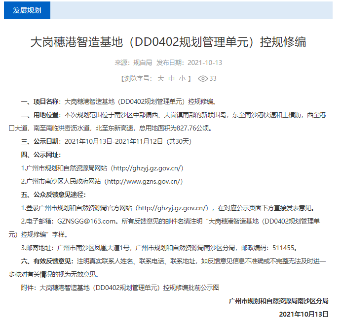 昨日,南沙区政府网公示了一份关于“大岗穗港智造基地(dd0402规划管理单元)控规修编”的公示文件,文件中提到公示日期为2021年10月13日-2021年11月12日(共30天)。